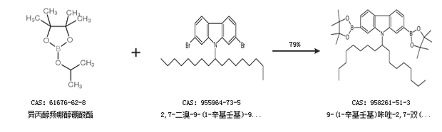 1.通過異丙醇頻哪醇硼酸酯和2,7-二溴-9-(1-辛基壬基)-9H-咔唑合成9-(1-辛基壬基)咔唑-2,7-雙(硼酸頻哪醇酯),收率約79%;