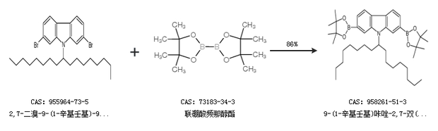 2.通過2,7-二溴-9-(1-辛基壬基)-9H-咔唑和聯(lián)硼酸頻那醇酯合成9-(1-辛基壬基)咔唑-2,7-雙(硼酸頻哪醇酯),收率約86%;