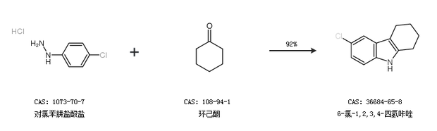 1.通過對(duì)氯苯肼鹽酸鹽和環(huán)己酮合成6-氯-1,2,3,4-四氫咔唑,收率約92%;