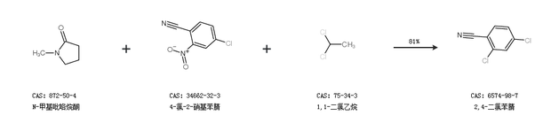 1.通過(guò)N-甲基吡咯烷酮、4-氯-2-硝基苯腈和1,1-二氯乙烷合成2,4-二氯苯腈,收率約81%;