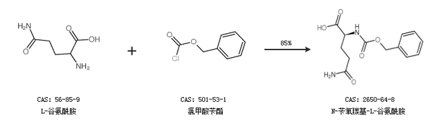 1.通過L-谷氨酰胺和氯甲酸芐酯合成N-芐氧羰基-L-谷氨酰胺,收率約85%;