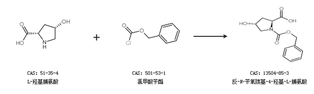 1.通過(guò)L-羥基脯氨酸和氯甲酸芐酯合成反-N-芐氧羰基-4-羥基-L-脯氨酸,收率約99%;