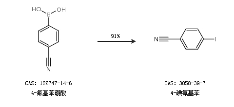 2.通過4-氰基苯硼酸合成4-碘氰基苯,收率約91%;