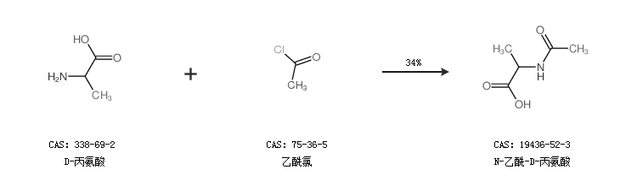 1.通過D-丙氨酸和乙酰氯合成N-乙酰-D-丙氨酸,收率約34%;