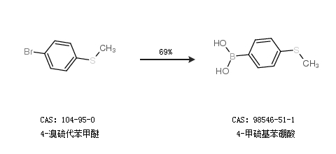 1.通過4-溴硫代苯甲醚合成4-甲硫基苯硼酸,收率約69%;