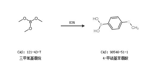 2.通過三甲氧基硼烷合成4-甲硫基苯硼酸,收率約83%;