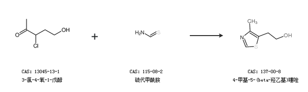 1.通過(guò)3-氯-4-氧-1-戊醇和硫代甲酰胺合成4-甲基-5-(beta-羥乙基)噻唑