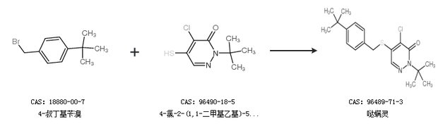 1.通過對叔丁基氯芐和4-氯-2-(1,1-二甲基乙基)-5-疏基-3(2H)-吡嗪酮合成噠螨靈,收率約85%;