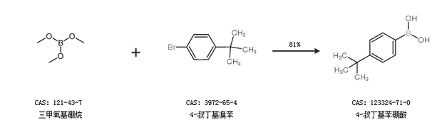 2.通過(guò)三甲氧基硼烷和4-叔丁基溴苯合成4-叔丁基苯硼酸,收率約81%;
