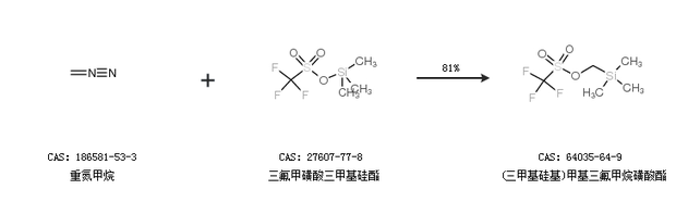 2.通過(guò)重氮甲烷和三氟甲磺酸三甲基硅酯合成(三甲基硅基)甲基三氟甲烷磺酸酯,收率約81%;