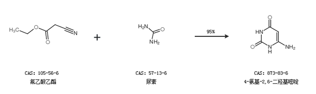 1.通過氰乙酸乙酯和尿素合成4-氨基-2,6-二羥基嘧啶,收率約95%;