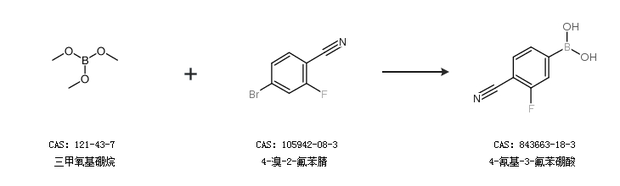 1.通過三甲氧基硼烷和4-溴-2-氟苯腈合成4-氰基-3-氟苯硼酸
