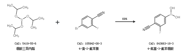 2.通過硼酸三異丙酯和4-溴-2-氟苯腈合成4-氰基-3-氟苯硼酸,收率約69%;