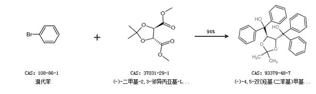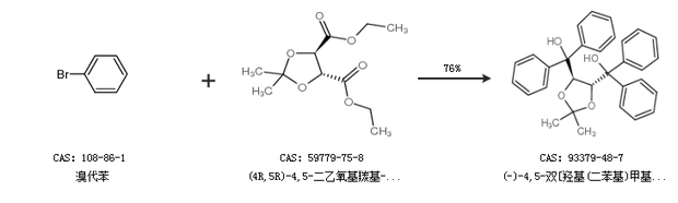 2.通過溴代苯和(4R,5R)-4,5-二乙氧基羰基-2,2-二甲基二氧合成(-)-4,5-雙[羥基(二苯基)甲基]-2,2-二甲基-1,3-二氧戊環(huán),收率約76%;