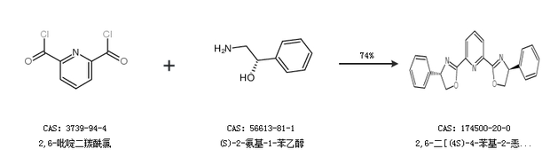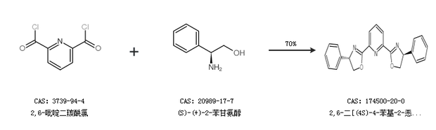 1.通過2,6-吡啶二羰酰氯和(S)-2-氨基-1-苯乙醇合成2,6-二[(4S)-4-苯基-2-惡唑啉基]吡啶,收率約74%;