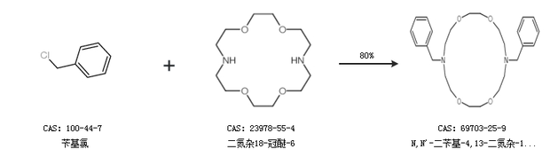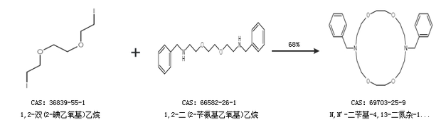 1.通過1,2-雙(2-碘乙氧基)乙烷和1,2-二(2-芐氨基乙氧基)乙烷合成N,N''-二芐基-4,13-二氮雜-18-冠6-醚,收率約68%;