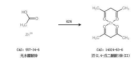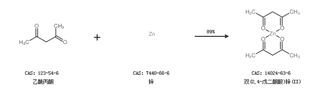 1.通過乙酰丙酮和鋅合成雙(2,4-戊二酮酸)鋅(II),收率約89%;
