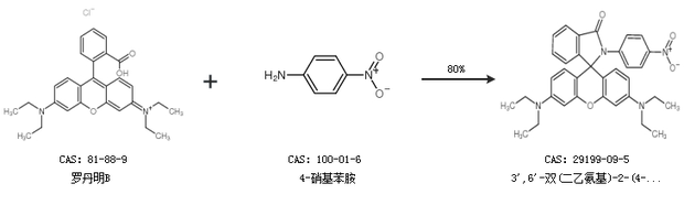 1.通過羅丹明B和4-硝基苯胺合成3'',6''-雙(二乙氨基)-2-(4-硝基苯基)螺[異吲哚-1,9''-氧雜蒽]-3-酮,收率約80%;