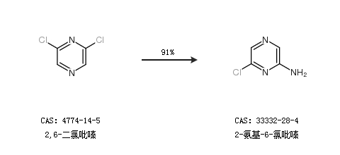 1.通過(guò)2,6-二氯吡嗪合成2-氨基-6-氯吡嗪,收率約91%;