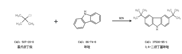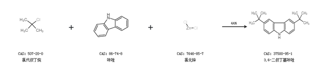 2.通過氯代叔丁烷、咔唑和氯化鋅合成3,6-二叔丁基咔唑,收率約44%;