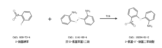 1.通過2-硝基碘苯和雙(2-氨基苯基)二硫合成2-氨基-2''-硝基二苯硫醚,收率約71%;