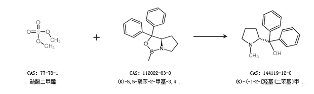 1.通過(guò)硫酸二甲酯和(R)-5,5-聯(lián)苯-2-甲基-3,4-丙醇-1,3,2-惡唑硼烷合成(R)-(-)-2-[羥基(二苯基)甲基]-1-甲基吡咯烷