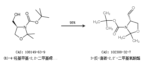 1.通過(R)-4-羥基甲基-2,2-二甲基噁唑啉-3-羧酸叔丁酯合成3-反-溴碳-2,2''-二甲基氧酸酯,收率約98%;