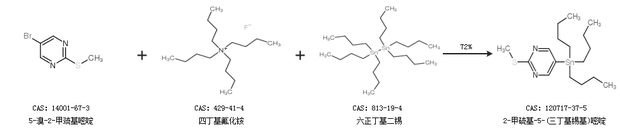 1.通過5-溴-2-甲巰基嘧啶、四丁基氟化銨和六正丁基二錫合成2-甲硫基-5-(三丁基錫基)嘧啶,收率約72%;