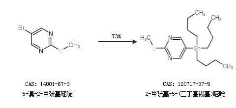 2.通過5-溴-2-甲巰基嘧啶合成2-甲硫基-5-(三丁基錫基)嘧啶,收率約73%;