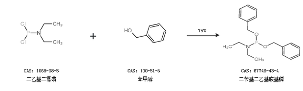 1.通過二乙基二氯磷和苯甲醇合成二芐基二乙基胺基膦,收率約75%;