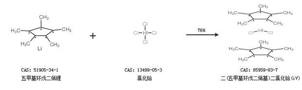 2.通過正丁基鋰、1,2,3,4,5-五甲基環(huán)戊二烯和氯化鉿合成二(五甲基環(huán)戊二烯基)二氯化鉿(iV),收率約72%;