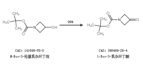 1.通過(guò)N-Boc-3-羥基氮雜環(huán)丁烷合成1-Boc-3-氮雜環(huán)丁酮,收率約99%;